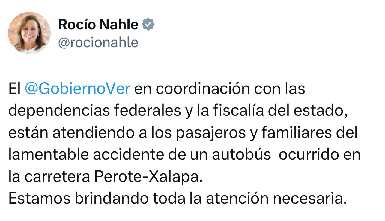Xalapa, Ver., viernes 27 de diciembre de 2024.- La gobernadora Rocío Nahle García informó a través de sus redes sociales que se ha desplegado una pronta atención por el accidente ocurrido durante la madrugada en la autopista Amozoc-Perote.