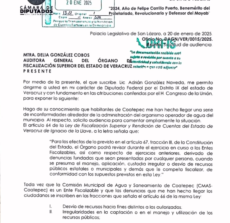 XALAPA, VER.- El diputado federal Adrián González Naveda, informó que solicitó de manera formal al Órgano de Fiscalización Superior ORFIS (ORFIS), realice una auditoría a la Comisión Municipal de Agua y Saneamiento de Coatepec, debido a las quejas de omisión, maltrato y opacidad.