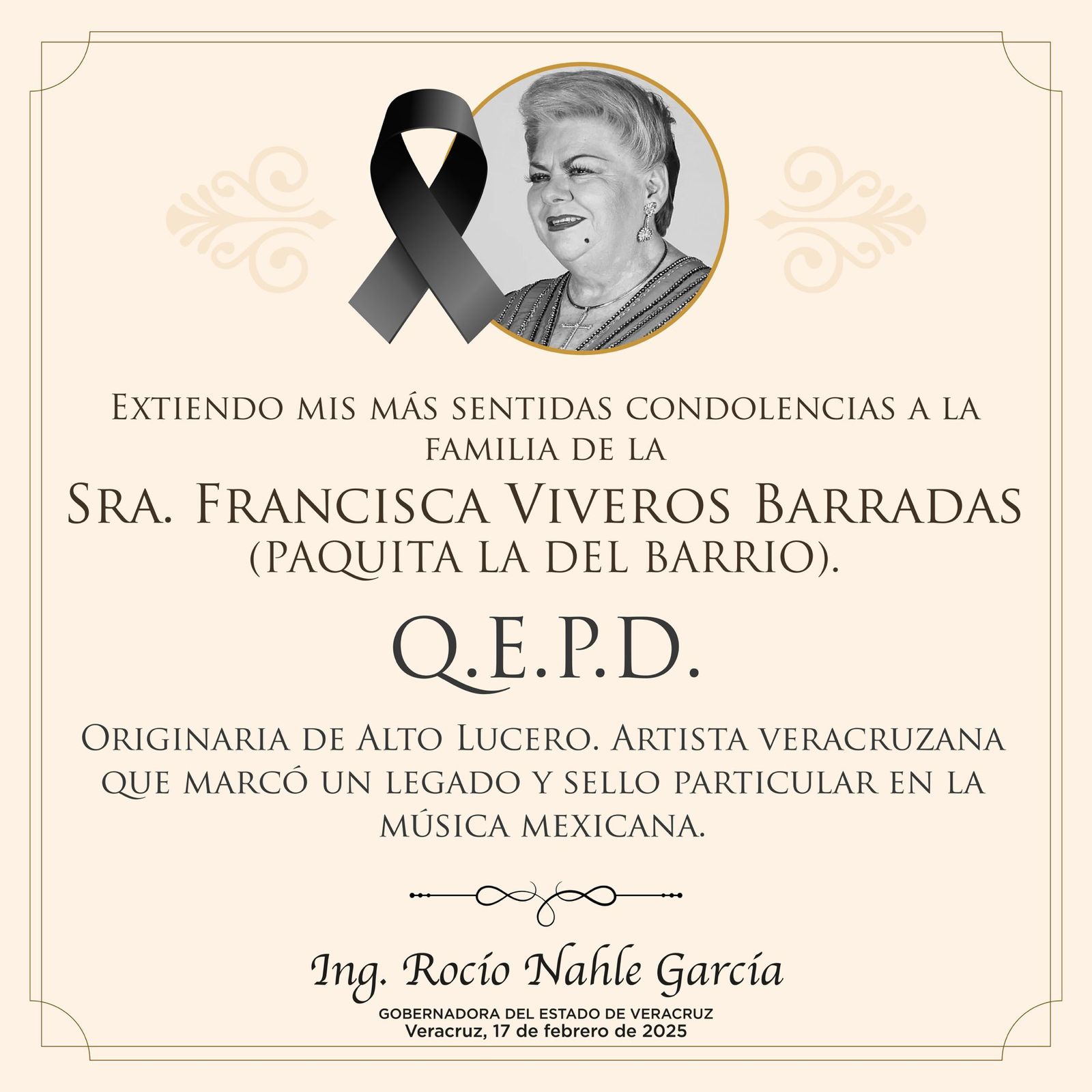 Xalapa, Ver., lunes 17 de febrero de 2025.- La gobernadora Rocío Nahle García expresó sus condolencias a la familia de Francisca Viveros Barradas, conocida como Paquita la del Barrio, y se unió a la pena por su fallecimiento.
