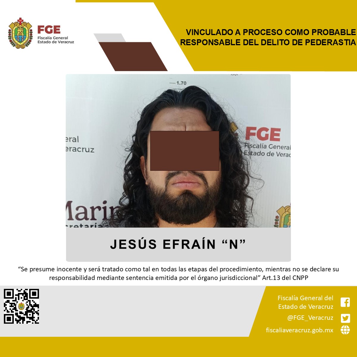 Xalapa, Ver., 5 de marzo 2025.- La Fiscalía Especializada para la Investigación de Delitos de Violencia Contra la Familia, Mujeres, Niñas y Niños y Trata de Personas obtuvo vinculación a proceso en contra de Jesús Efraín “N” como probable responsable del delito de pederastia, cometido en agravio de una adolescente de identidad resguardada.