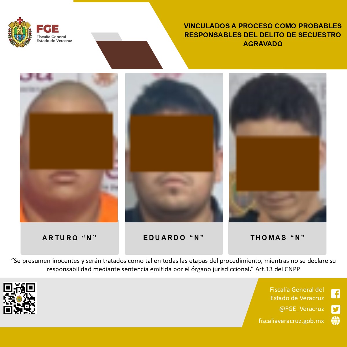 Alvarado, Ver., 18 de marzo de 2025.-La Fiscalía General del Estado, a través de la Unidad Especializada en Combate al Secuestro, obtuvo vinculación a proceso en contra de Arturo “N”, Eduardo “N” y Thomas “N”, este último de nacionalidad colombiana, como probables responsables del delito de secuestro agravado, cometido en agravio de las víctimas identificadas con las iniciales A.V.C., y E.F.V.