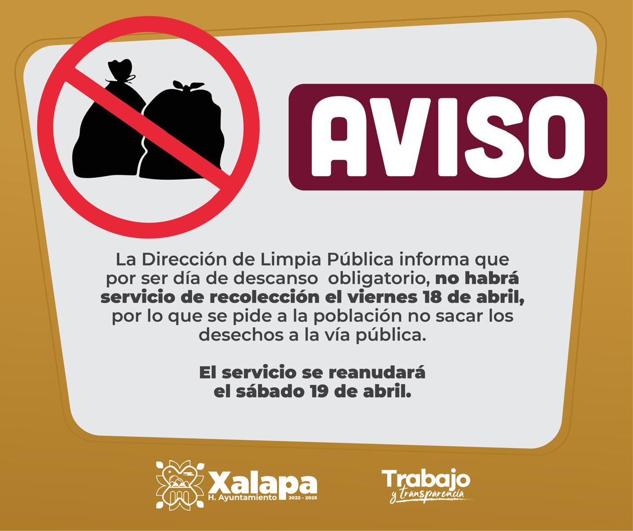 Xalapa, Ver.- Por ser día de descanso obligatorio, el viernes 18 de abril no habrá servicio de recolección de desechos urbanos, informó la Dirección de Limpia Pública.