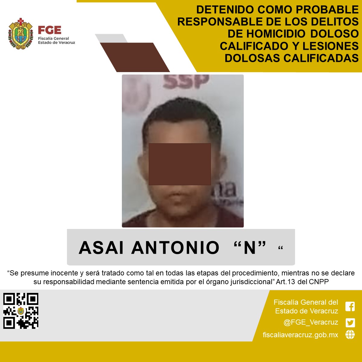 Acayucan, Ver., a 29 de mayo 2025.- La Fiscalía General del Estado informa que, elementos de la Policía Ministerial en coordinación con Fuerzas Federales y estatales, cumplimentaron una orden de aprehensión en la localidad Villa Alta, perteneciente al municipio de Texistepec, emitida por un juez de control con sede en este distrito, en contra de Asai Antonio “N” como probable responsable de los delitos de homicidio doloso calificado cometido en agravio de las víctimas identificadas con las iniciales Y. L. G., A. N. R., M. A. N. L., S. M. D., y M. N. A., y lesiones dolosas calificadas cometido en agravio de las víctimas identificadas con las iniciales A. T. Q., y B. E. M. F.