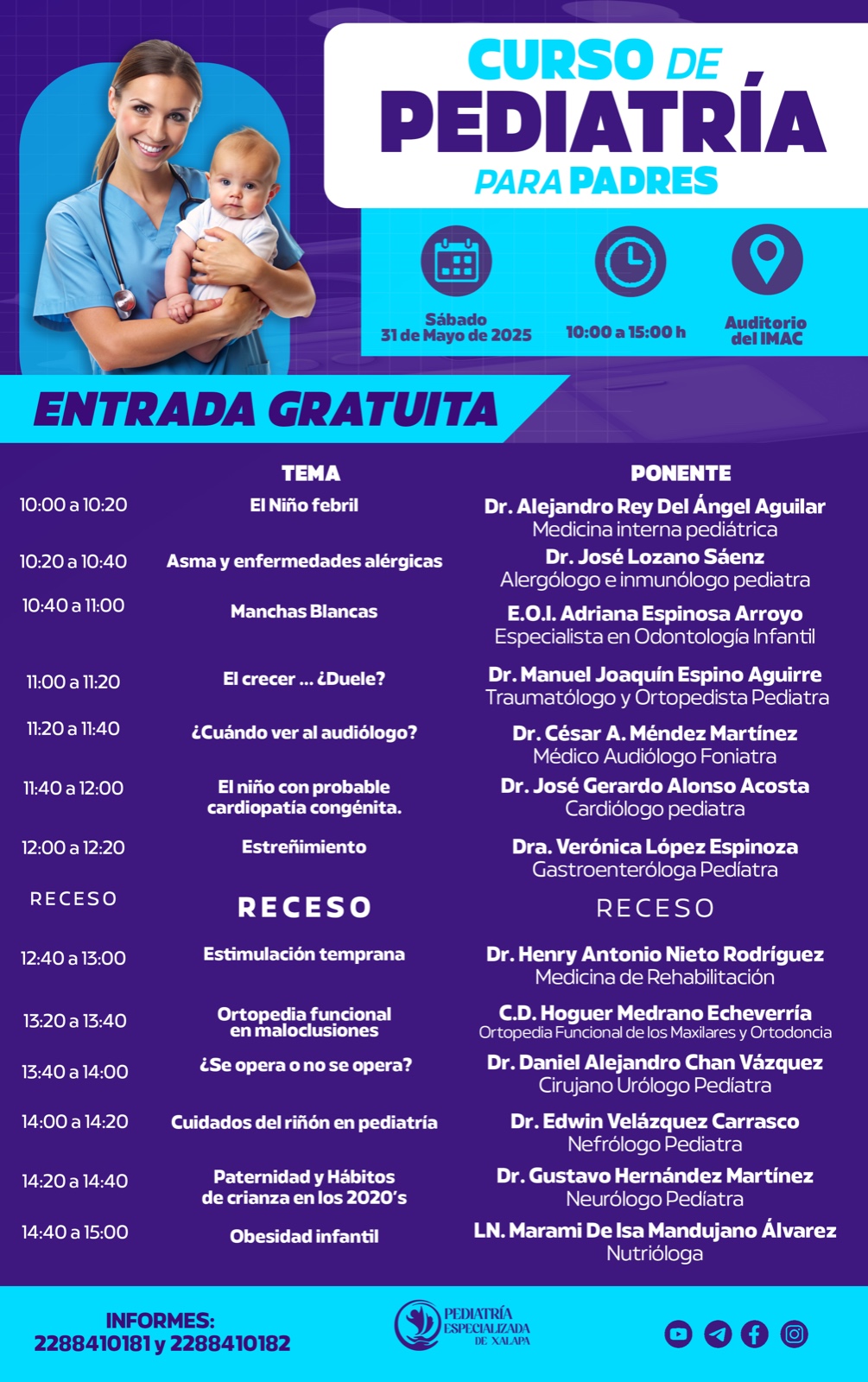 El doctor pediatra, José Lozano, informó que la entrada será gratuita al tiempo de dejar en claro que la salud y el bienestar de “nuestros hijos es lo más importante, por ello, Pediatría Especializada de Xalapa invita a madres, padres y cuidadores al Curso de Pediatría para Padres, un espacio educativo diseñado para brindar orientación clara, actualizada y profesional sobre temas clave del desarrollo infantil.”