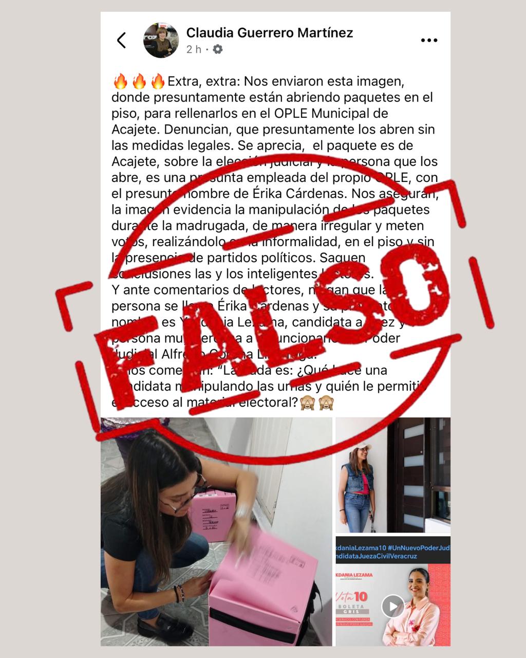 Xalapa, Veracruz, 11 de junio de 2025. El Organismo Público Local Electoral del Estado de Veracruz (OPLE Veracruz) informa a la ciudadanía que, en relación con la imagen que ha circulado recientemente en redes sociales, en la que se afirma que corresponde al Consejo Municipal de Acajete y muestra a una persona manipulando un paquete relacionado con la elección judicial, aclaramos categóricamente que dicha información es falsa.