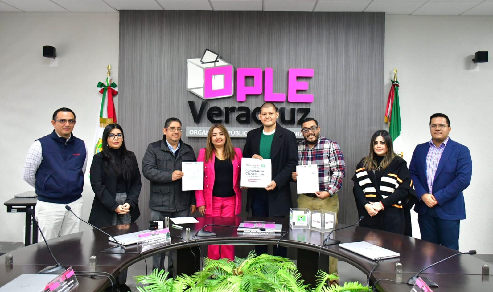 Integrantes del Consejo General del Organismo Público Local Electoral del Estado de Veracruz (OPLE Veracruz), encabezado por la Consejera Presidenta, Marisol Alicia Delgadillo Morales, recibieron de manos de los representantes de ambos partidos, Gabriel Onésimo Zúñiga Obando y Carlos Daniel Bueno Montaño, de Morena y PVEM, respectivamente.