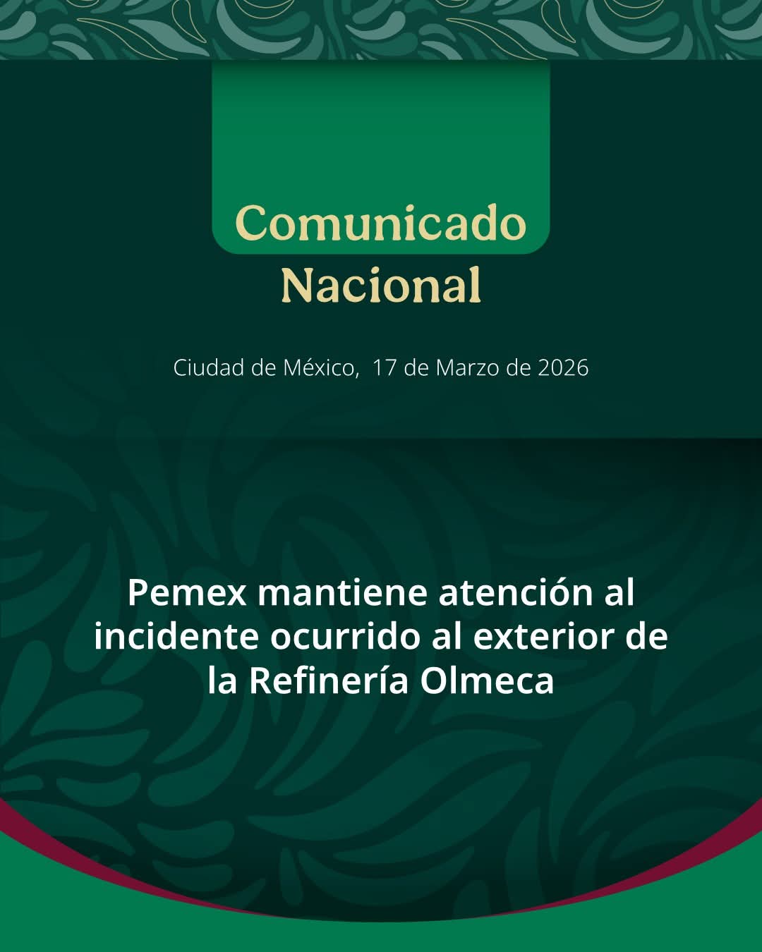Al momento, el suceso se encuentra controlado y no representa riesgo para la población ni para las y los trabajadores; personal del área de Salvaguardia Estratégica de la empresa se encuentra colaborando con las autoridades correspondientes para determinar las causas del incidente.