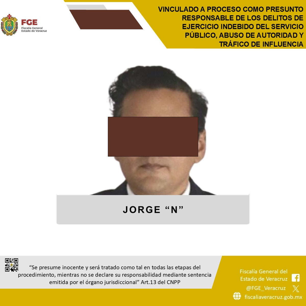 Xalapa, Ver., 24 de marzo de 2026.- Como resultado de las investigaciones ministeriales, la Fiscalía General del Estado de Veracruz, a través de la Fiscalía de Investigaciones Ministeriales, logró que la autoridad judicial otorgara la vinculación a proceso en contra de Jorge “N”, señalado como presunto responsable de los delitos de ejercicio indebido del servicio público, abuso de autoridad y tráfico de influencia.