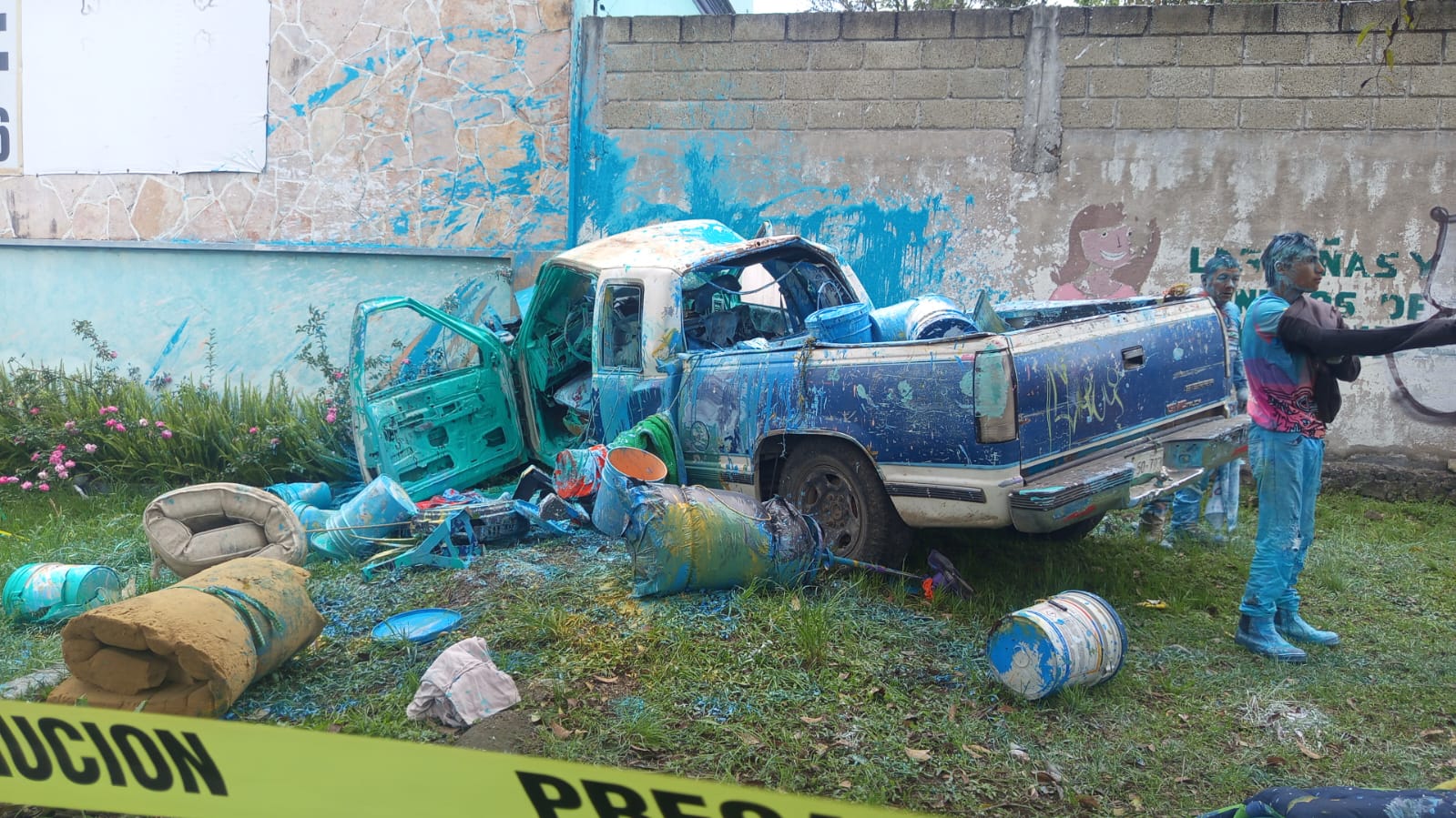 La camioneta transportaba galones de pintura, lo que provocó que los trabajadores terminaran cubiertos de este material tras el impacto.